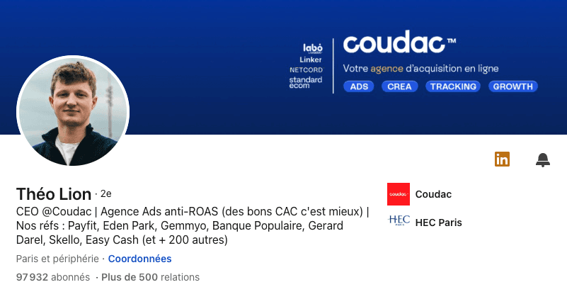 Ensuite, votre titre. La plupart des gens écrivent juste leur fonction : "CEO chez [Nom de la boîte]". C'est une opportunité gâchée. Votre titre doit contenir votre rôle précis, le bénéfice que vous apportez, et des mots-clés stratégiques pour le SEO LinkedIn. Par exemple : "Fondateur Scalify | J'aide les entrepreneurs à devenir des références grâce au personal branding | +100k€/an".